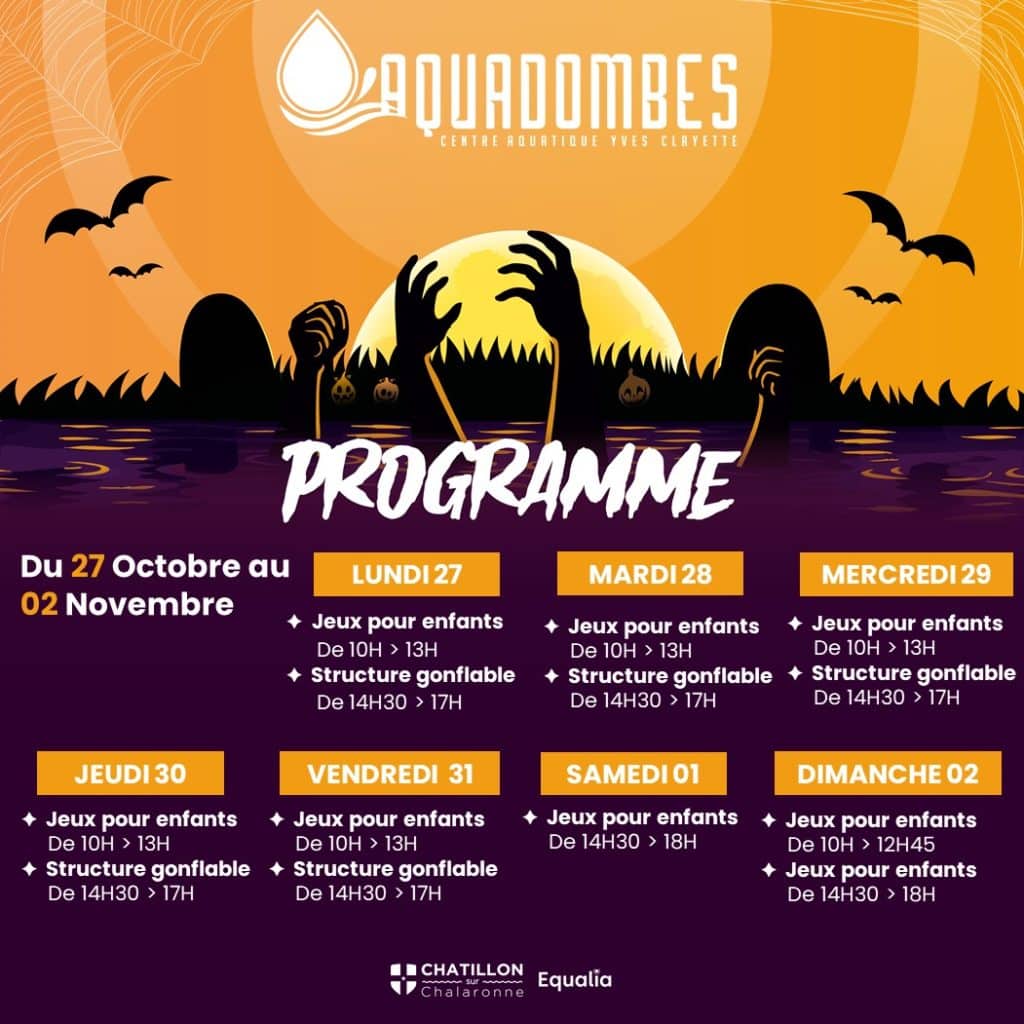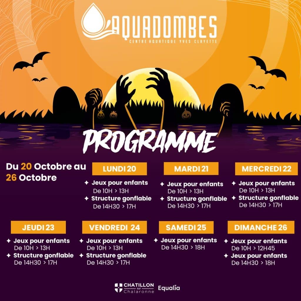 Aquadombes passe en mode vacances (et Halloween) pour la Toussaint ! Découvrez dès à présent le programme d'activités prévues pour les deux semaines. 🦇